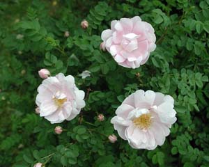 Rosa spinosissima ’Plena’, juhannusruusu Sen alkuperä on tuntematon. Ehkä ’Plena’ on ollut alun perin nimeämätön lajike, joka on levinnyt koko Suomeen. Ruotsissa tunnetaan ”Finlands vita ros” ja englanninkielisissä luetteloissa on ”Finnish White”. Juhannusruusua kasvatetaan myös Ruotsissa ja Virossa, mutta muissa maissa se on harvinainen tai tuntematon. Juhannusruusu 1-1,5 m korkea, piikkinen, melko pysty pensas, joka taipuu kukkien painon alla. Se kukkii juhannuksen aikoihin pari viikkoa. Kukat ovat löyhästi puolikerrannaisia, kermanvalkoisia, keskeltä kellertäviä, kullankeltaisia heteitä näkyy. Tuoksu on voimakas ja makea. Syksyllä lehdet värjäytyvät tumman violetin- ja viininpunaisiksi. Pyöreitä mustia kiulukoita muodostuu vain vähän. |